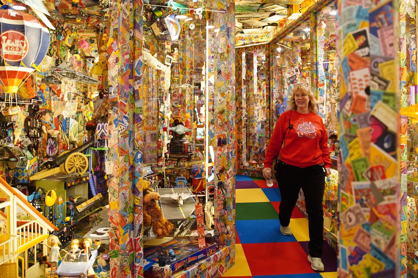 Castle Noel co-owner Dana Klaus walks through the "Enchanted I Had That Toyland" section of Castle Noel. (Ryan Loew / Ideastream Public Media)