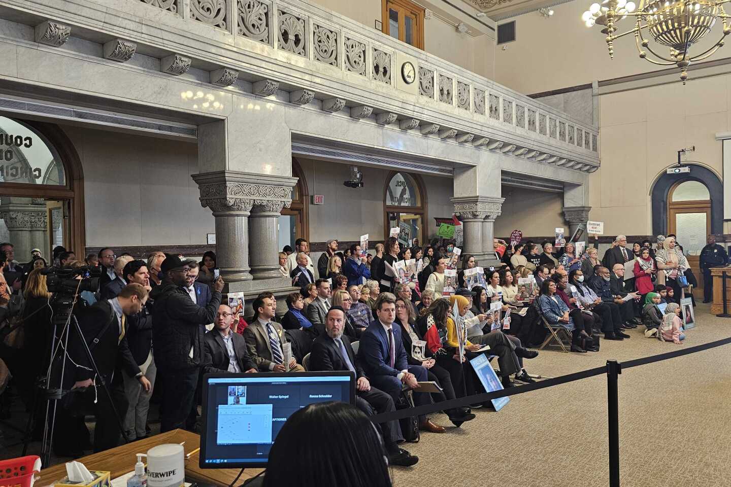 Cincinnati City Council chambers was standing room only on February 14, 2024, as hundreds of residents addressed Council for four hours. (Becca Costello / WVXU)