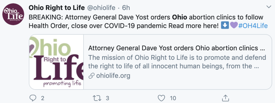Yost sent letters to Planned Parenthood of Southwest Ohio and the Women’s Med Center of Dayton, telling them to immediately stop performing non-essential and elective surgical abortions.