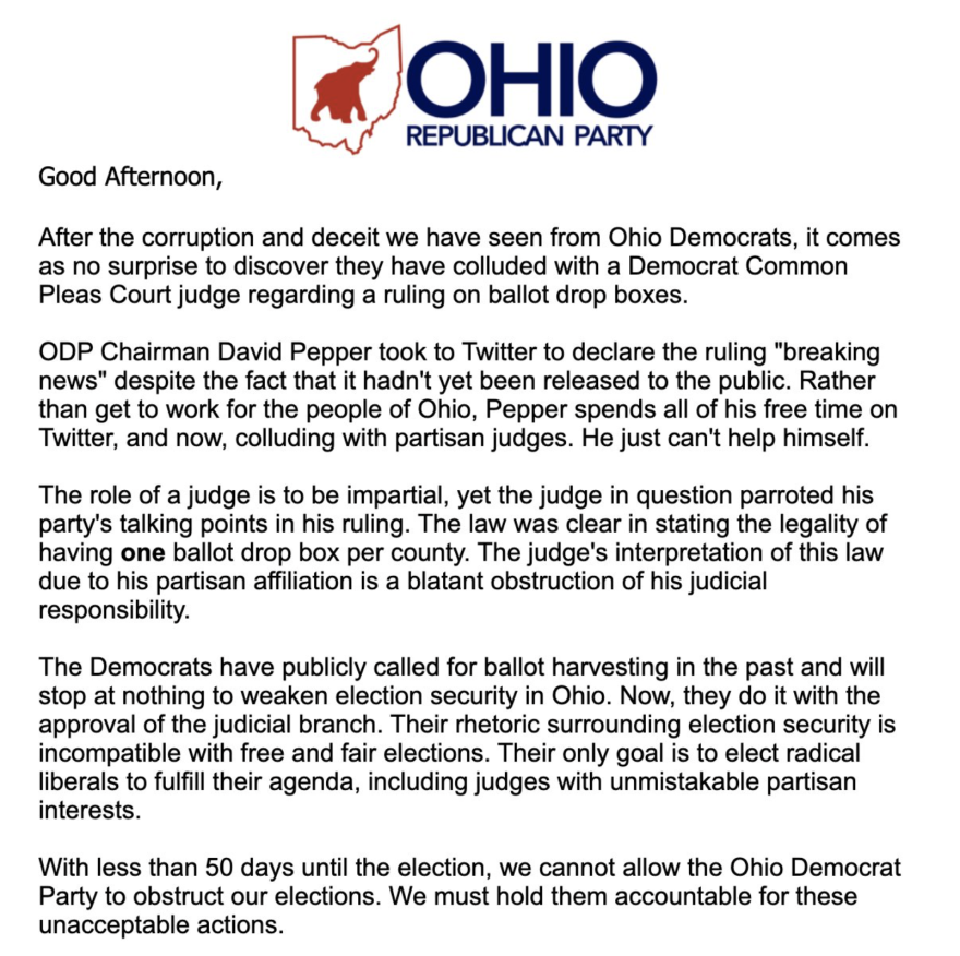 After the Franklin County Court’s initial ruling on drop boxes on September 16, 2020, the Ohio Republican Party tweeted an allegation that the court had colluded with ODP Chair Pepper in the course of that ruling. That unsubstantiated allegation prompted rebuke from many, including Republican Ohio Supreme Court Chief Justice Maureen O’Connor. When asked whether Ohio Republican Party Chair Jane Timken had approved of the comment, Evan Machan, communications director for the party responded saying, “you can attribute that statement to me.” Ohio Democratic Party Chairman Pepper asked the court to take action against the Ohio Republican Party. The tweet in question has since been removed.